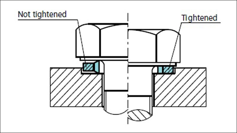 The metal washer ensures that the components to be connected are reliably and securely held. The thickness of the washer limits the compression of the elastomer seal, eliminating any over torque of the joint, thereby ensuring a reliable sealing system. The internal pressure increases the sealing force by energizing the sealing lip.